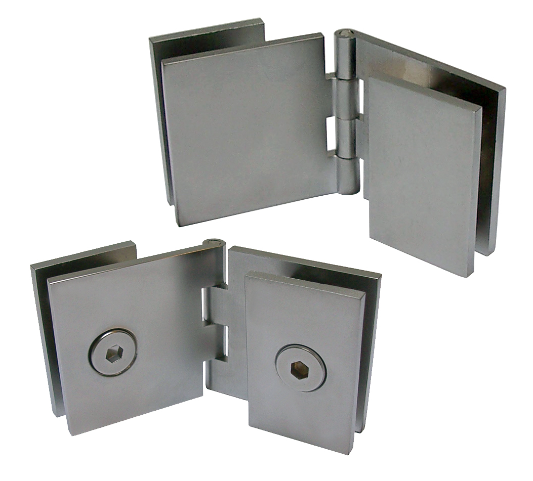 Adler hinges, square shape with straight edges. With wall plate, with wood screws or glass/glass mounting. Tightening by means of a threaded back plate, in tightening lug mounted to the plate. 40 x 40 mm. For 6-8 mm glass.