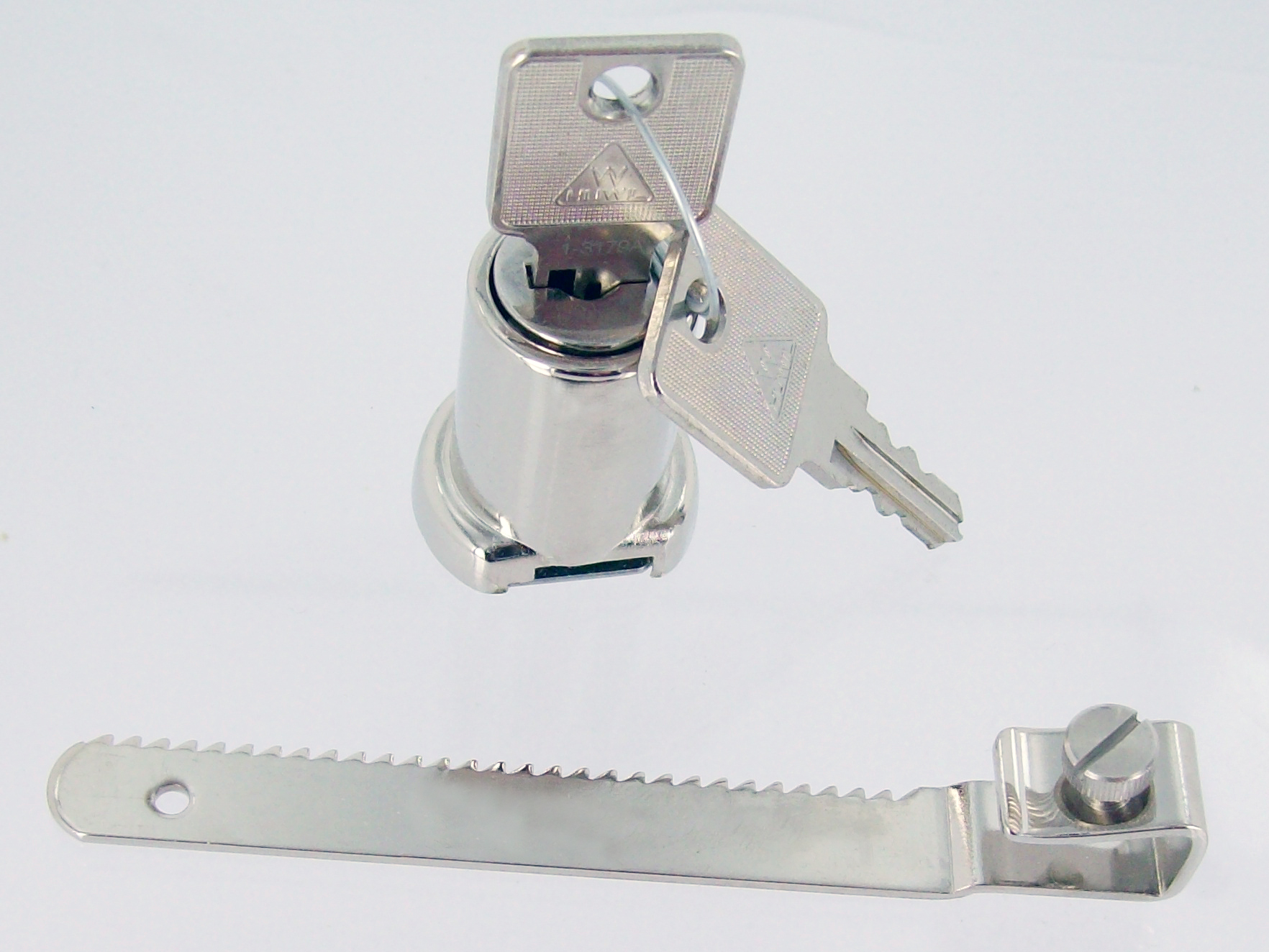 lock, Huwil ratchet lock, same key number, nickel plated