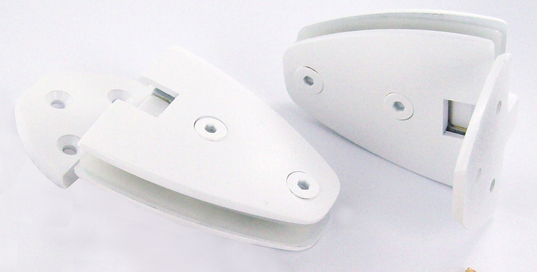 Charnières SUPER VENUS à platine murale; livrées avec vis bois 5 x 40 mm. Pour glace de 8 ou 10 mm. Arrêt de la porte en toutes positions sauf dans une zone de 10° de part et d'autre des positions 0°, 90° et 180°. Charge maximum pour une paire de charnières : 50 kg (H x l : 200 x 100 cm, en glace de 10 mm). Livrées avec cales en matière plastique. Laiton epoxy blanc (RAL 9010).