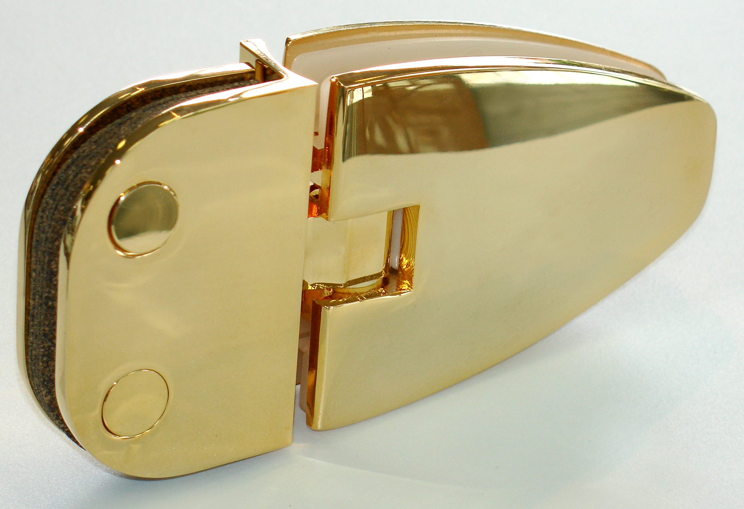 Scharniere SUPER VENUS, Glas/Glas zu 180°. Für 8 mm und 10 mmdicke Glasscheiben. Halten in jeder Stellung außer in einem Bereich von 10° zu beiden Seiten der 0°, 90° und 180° Stellung. Zugelassene Belastung 50 kg (H x l : 200 x 100 cm bei einer 10 mm dicken Glasscheibe). Lieferung mit Unterlegscheiben aus Plastik. Messing goldfarben