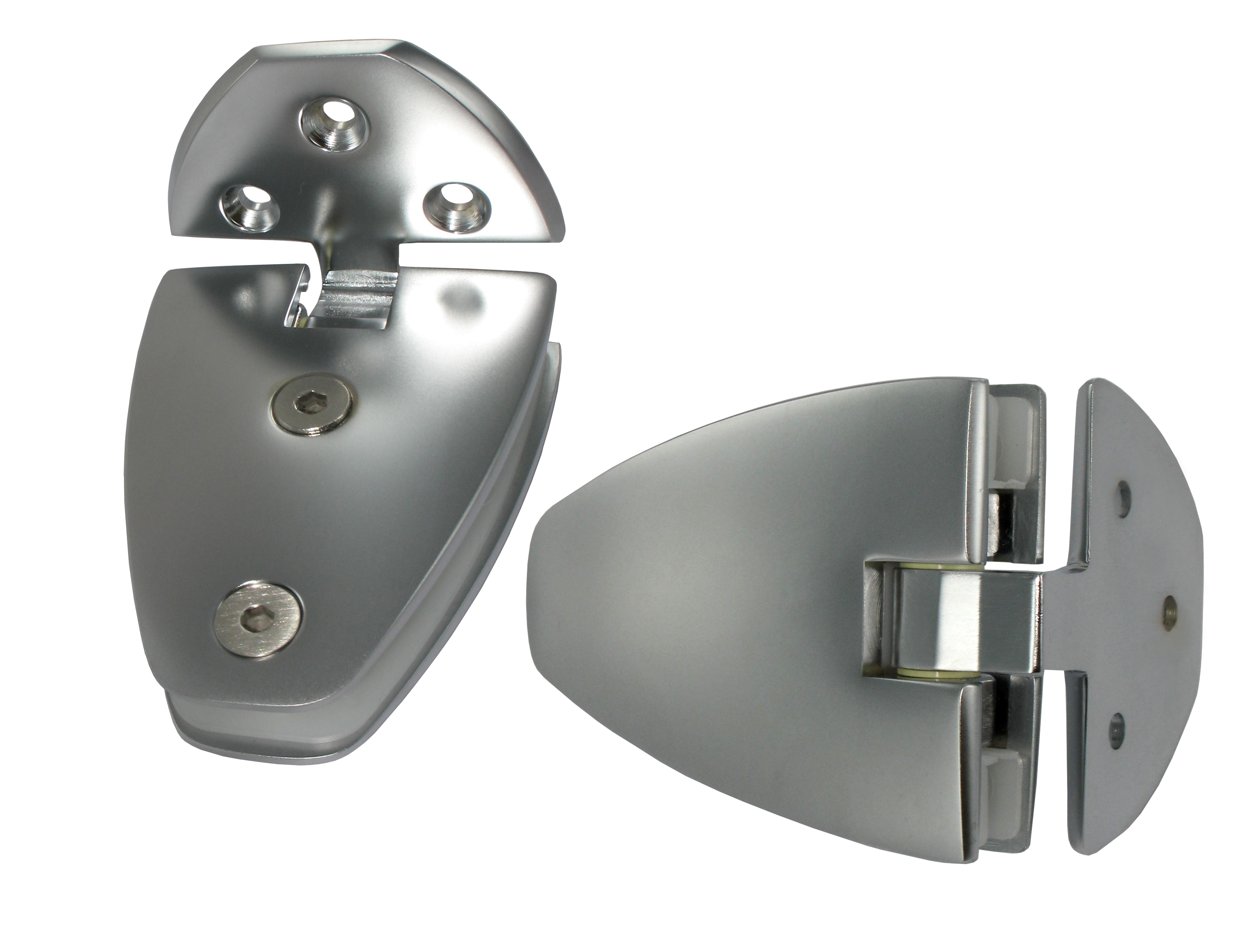Scharniere SUPER VENUS, mit Wandhalter (mit Holzschrauben 5 x 40 mm). Für 8 mm und 10 mmdicke Glasscheiben. Halten in jeder Stellung außer in einem Bereich von 10° zu beiden Seiten der 0°, 90° und 180° Stellung. Zugelassene Belastung 50 kg (H x l : 200 x 100 cm bei einer 10 mm dicken Glasscheibe). Lieferung mit Unterlegscheiben aus Plastik.