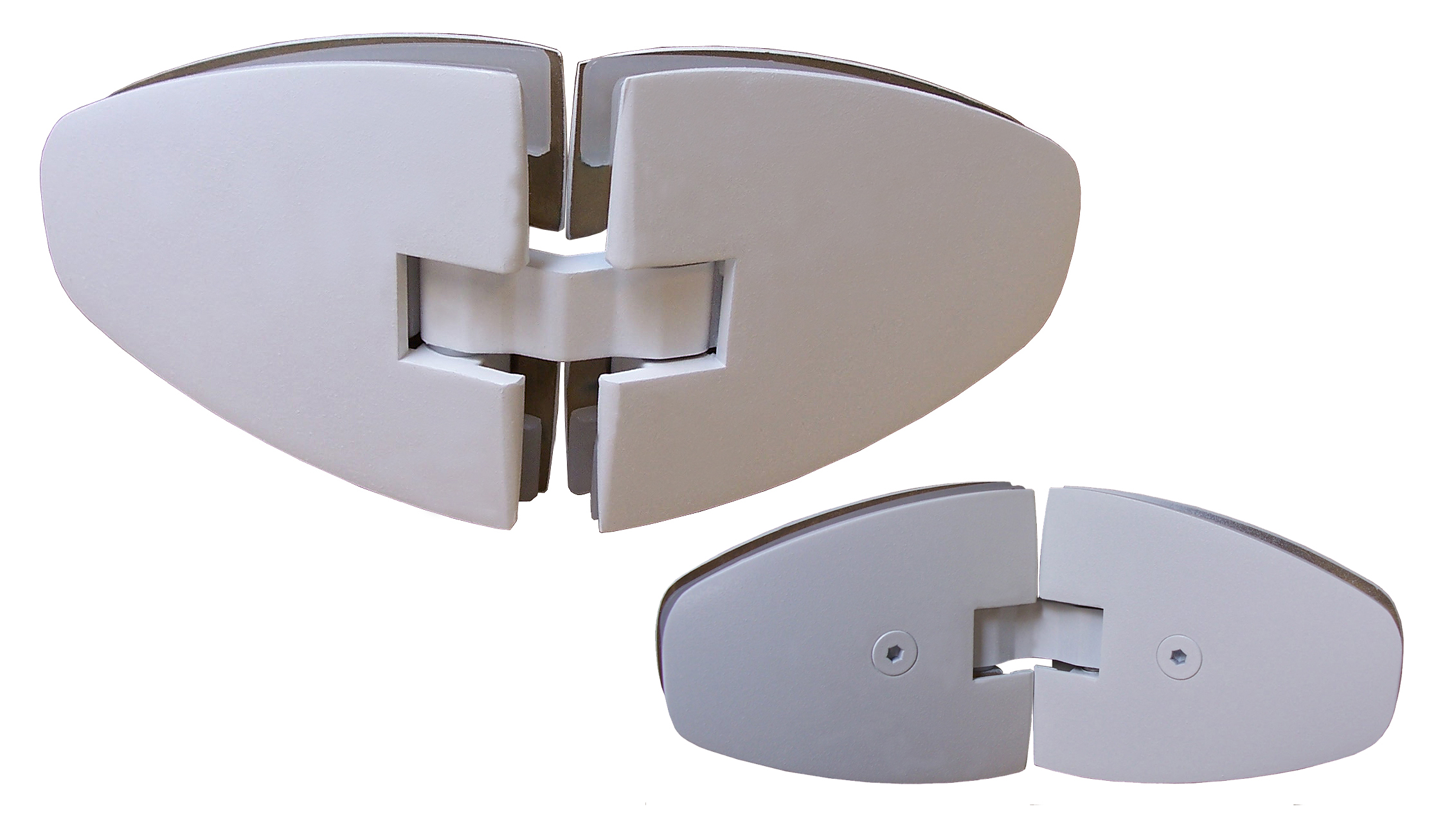 charnières VENUS glace / glace à 135°. pour glace de 8 mm. Laiton blanc. (RAL 9010) Les charnières Vénus assurent sur arrêt de la porte en toute position sauf dans une zone de 10° de part et d'autre des positions 0°, 90° et 180°. Pour portillon d'épaisseur 6mm (Vénus 6) ou 8mm (Vénus) ; charge maximum pour une paire de charnières : 25 kg ( H x I : 180 x 70 cm, en glace de 8mm). Livrées avec cales en matière plastique.