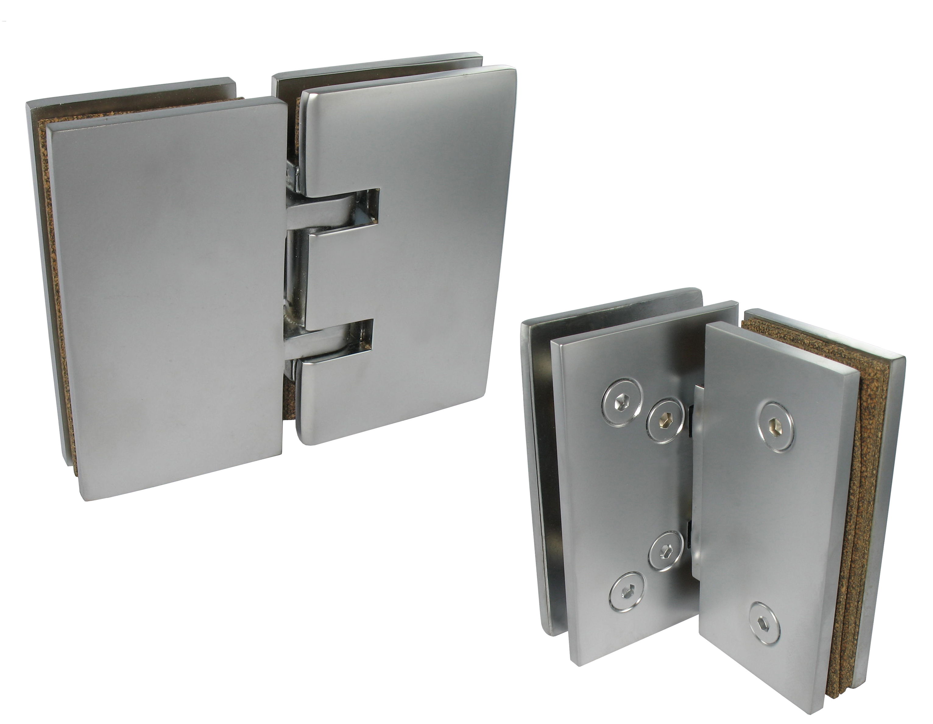 Scharniere ISODOUCHE Glas/Glas zu 180°. Messing verchromt matt. Für Tür, Stärke 8 bis 10 mm. Maximale Belastung für ein Scharnierpaar: Normal Modell : 31 kg (Höhe x Breite: 180 x 70 cm). Siehe technisches Blatt für grössere Volumen. Lieferung mit gestanzten Unterlegscheiben.