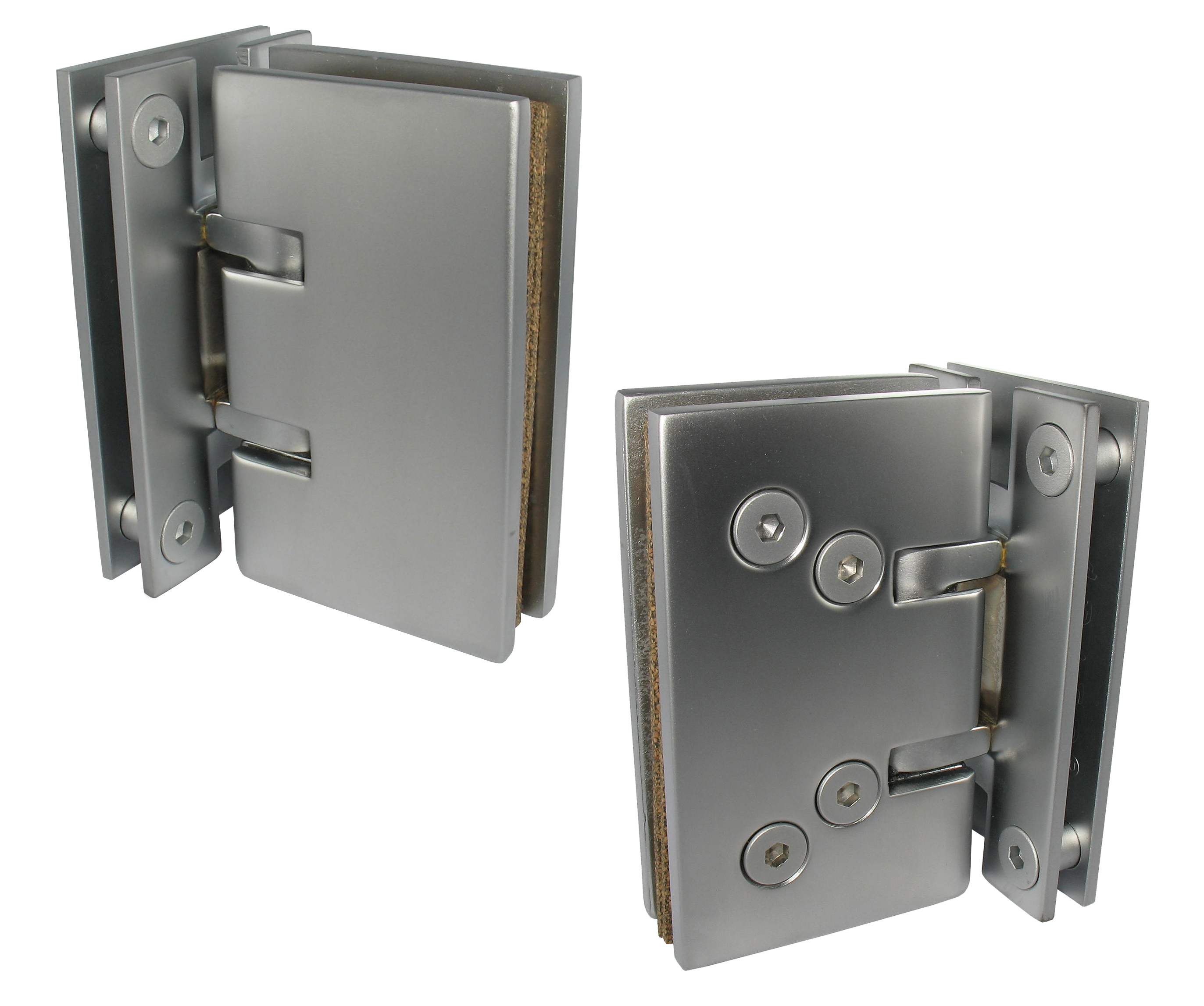 charnières ISODOUCHE® glace / glace 90° centrale. Laiton chromé mat. Arrêt en toute position sauf dans la zone de 15° de part et d?autre de la position 90° ; pour portillon d?épaisseur 8 à 10 mm, charge maximum pour une paire de charnières: 31 kg (H x l : 180 x 70 cm). Consulter la fiche technique pour volumes plus importants. Livrées avec cales découpées.