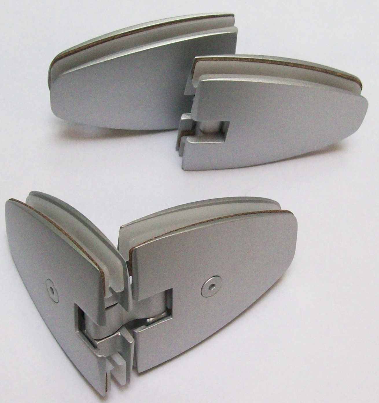 Scharniere VENUS Glas/Glas versetzt, Drehung um 180°. Für 8 mm dickem Glas. Messing Perlmutt. Halten in jeder Stellung außer in einem Bereich von 10° zu beiden Seiten der 0°, 90° et 180° Stellung. Für Türen aus 6 mm (Venus 6) oder 8 mm (Venus) dickem Glas. Maximale Belastung für ein Scharnierpaar: 25 kg ( H x I : 180 x 70 cm, bei 8 mm dickem Glas). Lieferung mit Unterlegscheiben aus Plastik