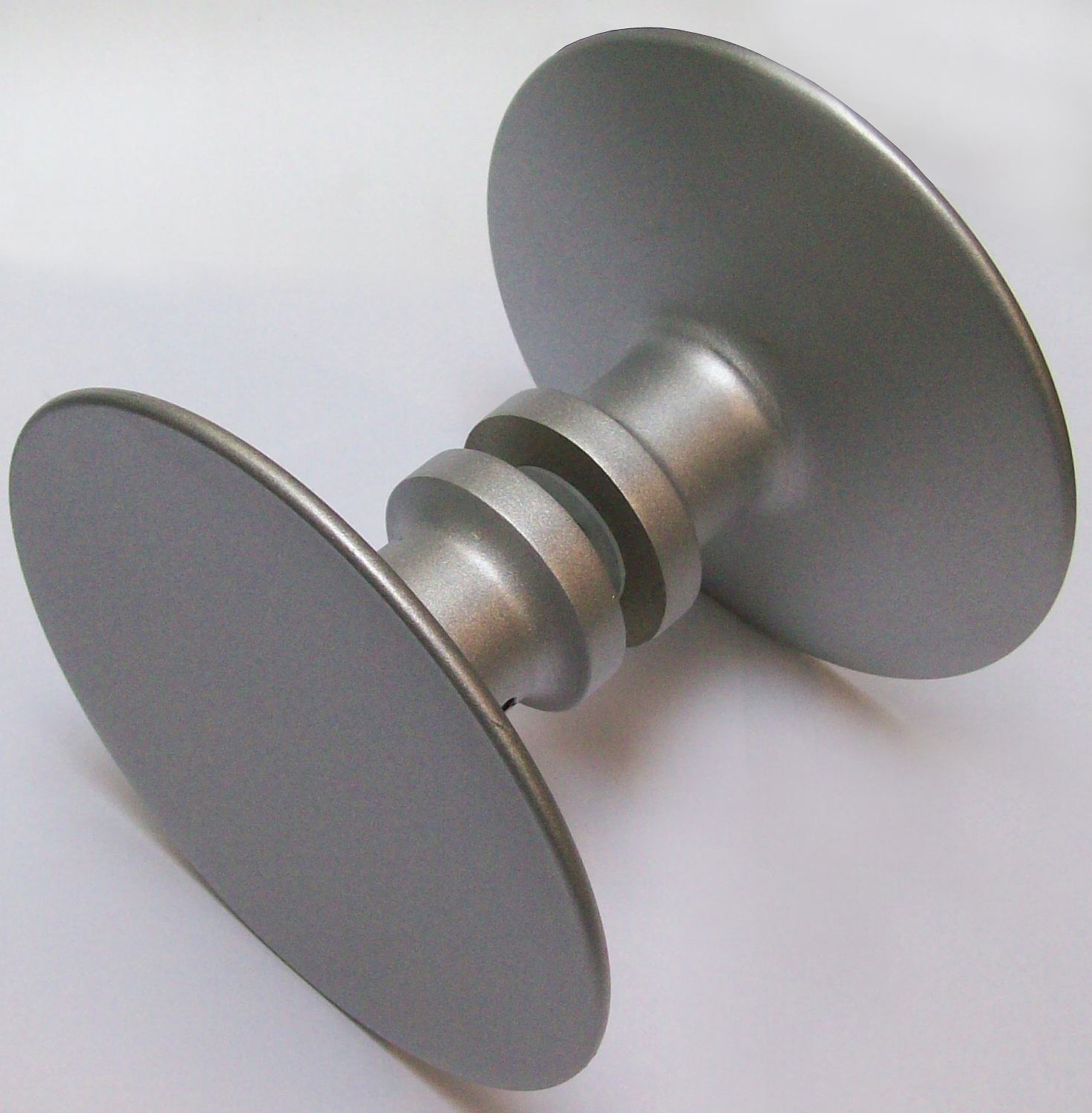 poignées coupes en aluminium anodisé naturel, épaisseur 8 mm, montées avec axes à fixation invisible, non démontables de l?extérieur. Pour glace de 8 à 12 mm. ø 142, saillie : 60, perçage de glace : 16.
