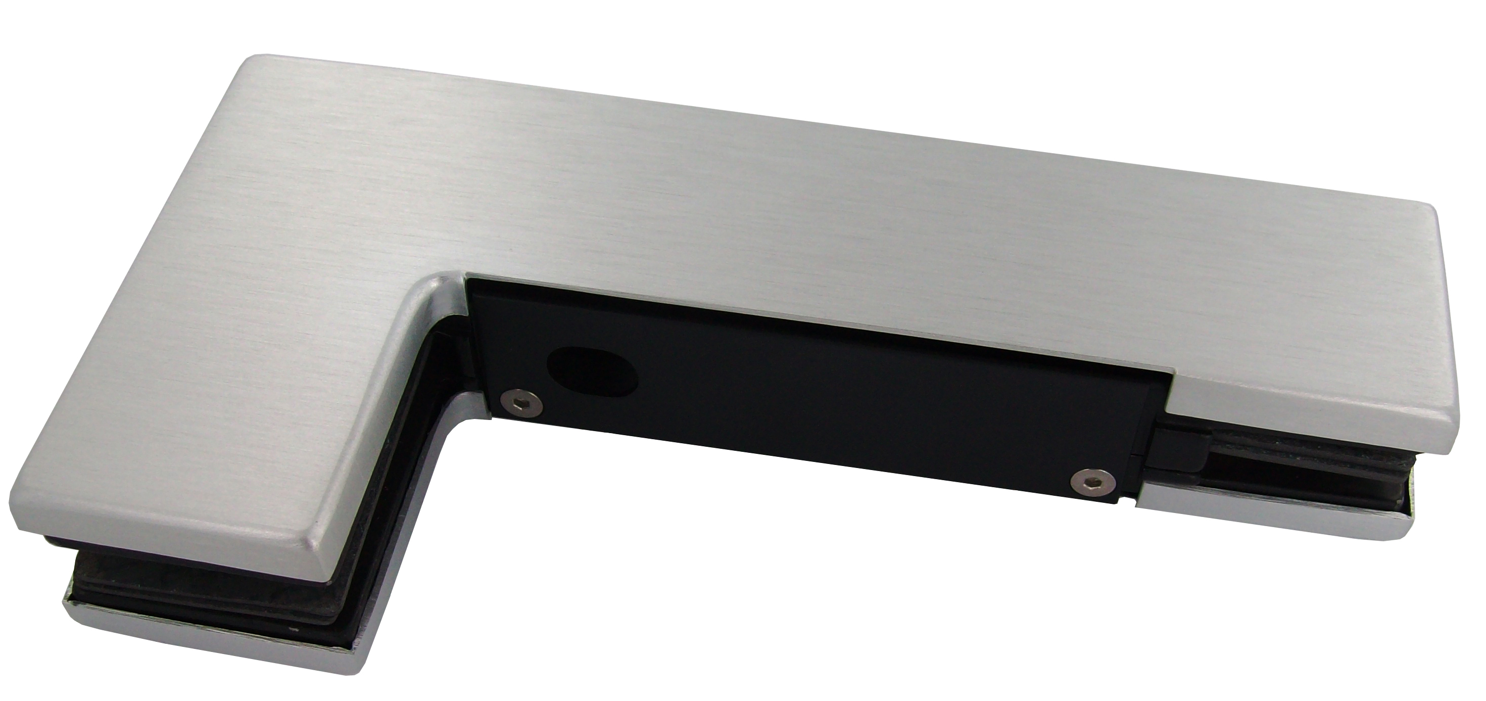 gamme "ELITE" : pince de jonction glace fixe latérale/imposte (côté poignée) avec gâche pour serrure d?angle. Décor : naturel.