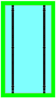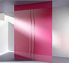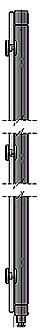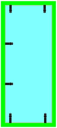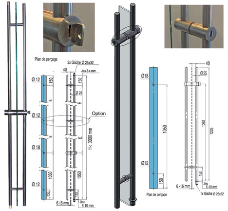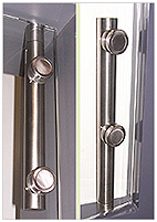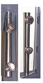 Les pentures pleines hauteur, comme les connecteurs simples, peuvent être collés à la glace (distance entre la surface du panneau et l’intérieur du tube = 2,5 mm) ou bien décollés de la glace grâce à des entretoises comparables à celles des poignées (distance entre la surface du panneau et l’intérieur du tube = 40 mm). Dans ce second cas, la raideur de la structure est encore augmentée, le nettoyage facilité, l’esthétique également originale. |