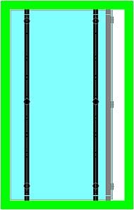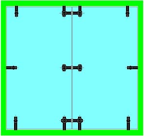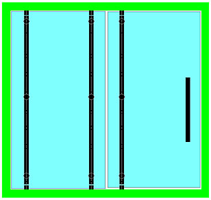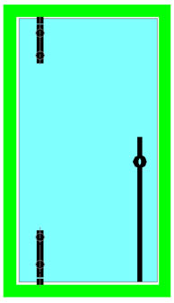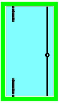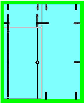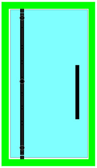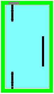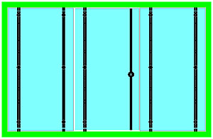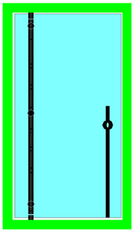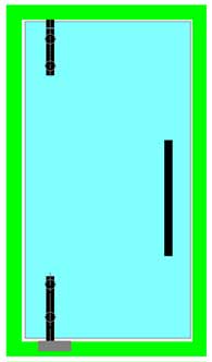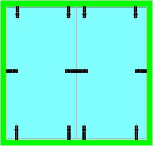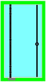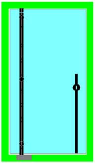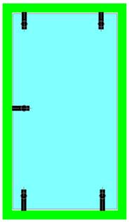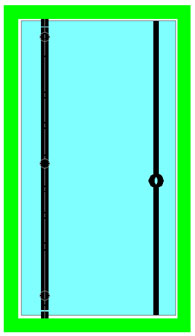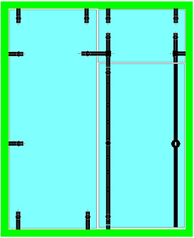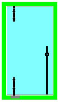 Le ou les points de fixation centraux contribuent directement à supporter le poids de la porte et la surcharge ; plus faiblement à contrer le porte-à-faux de la porte. Ils servent également à raidir très efficacement la porte, ce dernier point étant particulièrement important dans les cas de fort élancement ou de montage sur pivot de sol. Ils peuvent donc être positionnés à volonté, selon des critères souvent esthétiques : alignement sur les entretoises de poignées (**), ou sur les connecteurs du dormant au mur,… |