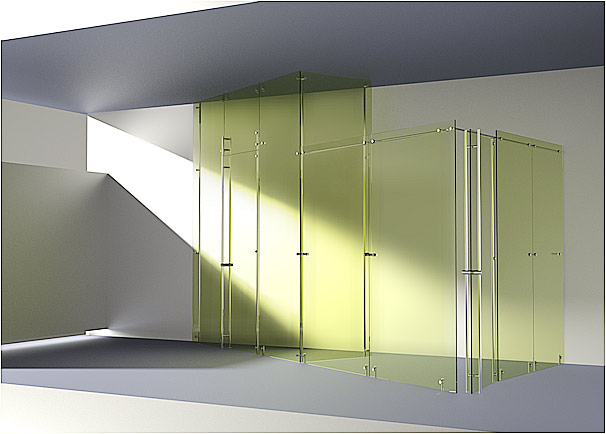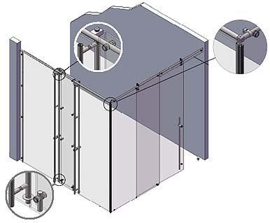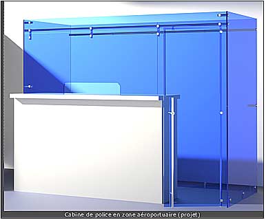 La cabine ci-contre est parfaitement hyperstatique et extrêmement rigide. Sa construction est très simple et rapide : pose des 2 latéraux et fixation des 2 raidisseurs ; puis agrafage d’une glace de façade - dès lors tout se tient ; finition de l’agrafage des éléments de façade, puis encliquetage de la porte ; repérage puis perçage de la gâche de la poignée à serrure intégrée ; scellement de la gâche en position verrouillée de la porte.