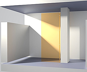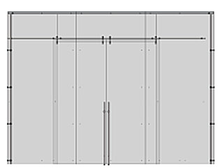 Ce modèle de construction particulièrement original est à préconiser particulièrement dans le cas de très grandes hauteurs. Les panneaux fixes et de portes peuvent être également très larges. Il est souhaitable d’équiper la porte d’une poignée pleine-hauteur. |