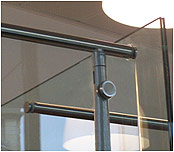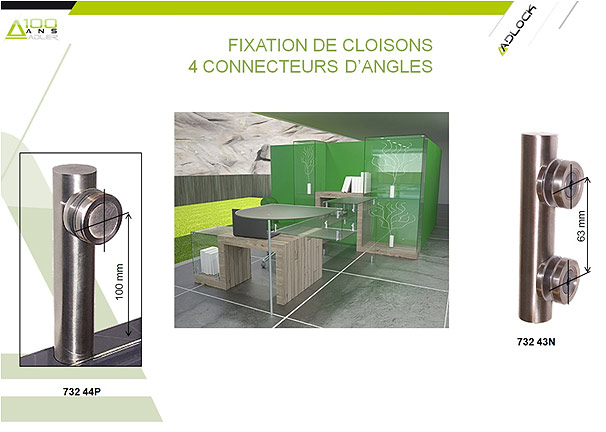 Les verres sont agrafés sur les tubes horizontaux par les points de fixation ADLOCK. Ils portent ces tubes en même temps que les tubes les retiennent verticalement. Ces tubes forment des raidisseurs (comme les raidisseurs de parois de douche) ; dont ils reprennent les fixations murales, d’équerre (départ à 90° du mur ou d’une glace) ou d’angle (de 90° à 45°).