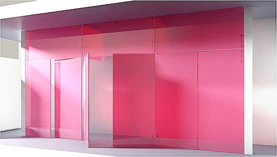Le principe raidisseur des pentures pleine-hauteur, exploité précédemment pour de grandes portes, est ici repris, mais horizontalement, pour assurer la cohérence de l’ensemble de la construction. Une structure tubulaire horizontale lie toutes les glaces de la construction entre elles ; l’ensemble (tubes & glaces) forme une structure indéformable et très rigide. |