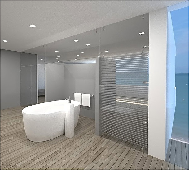 2ème exemple : Assez proche de l’exemple précédent, il s’en différencie cependant par le fait que la poutre qui apporte la raideur horizontale de la cloison n’est plus portée au-dessus de la cloison par des poignées formant poteaux mais directement par les glaces de la cloison elles-mêmes. Les glaces sont vissées fermement par des points ADLOCK en applique sur la poutre qui est elle-même portée par les glaces. L’ensemble peut être avantageusement rigidifié par des poteaux d’angle constitués de deux double-poignées pleines hauteur de diamètre 25 mm, dont les poignées intérieures à l’angle de chacune de ces double-poignées sont confondues pour former un seul et même tube vertical. Ce tube peut être avantageusement fixé dans le sol et sous la poutre supérieure. Dans la construction suivante, la façade comprend une double-porte coulissante ADSLIDE. |