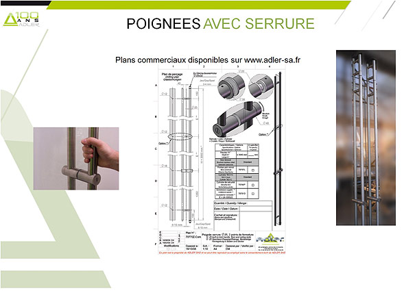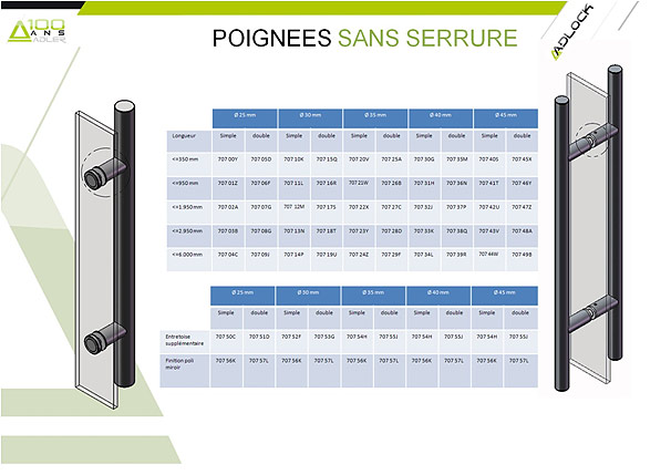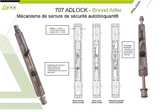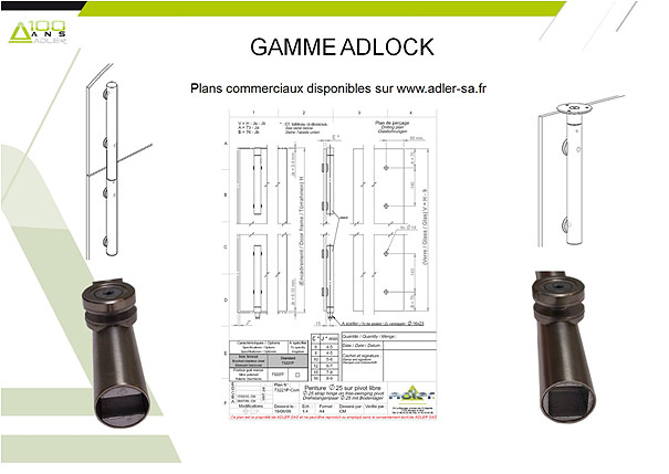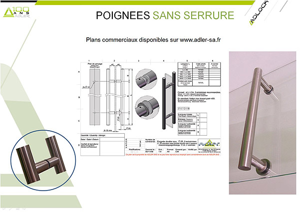 ADLOCK est une gamme complète de poignées de porte, de pentures, de connecteurs en tubes d’acier inoxydable de diamètre 20, 25, 30, 35, 40 ou 45 mm, brossé ou poli. Elle exploite plusieurs brevets d’ADLER SAS, pour la fixation extraordinaire du verre (points ADLOCK de diamètre 30 mm comprenant une vis M8 à serrer à bloc) comme pour le mécanisme de serrure de sécurité auto-verrouillant : glaces recommandées Cf. page 3.