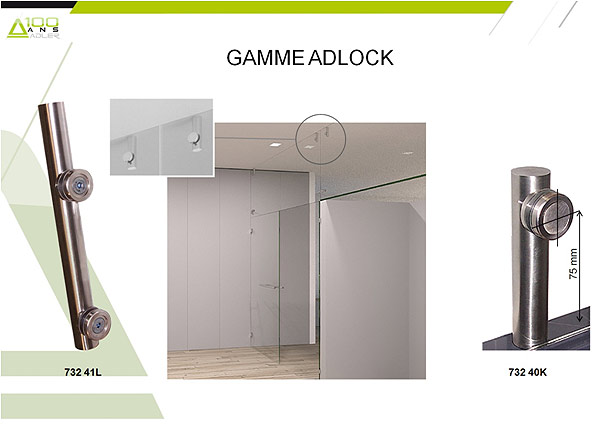La gamme ADLOCK est conçue pour être modulaire, s’appuyant sur des composants très élaborés et parfaitement éprouvés : mécanisme de serrure de sécurité en diamètre 23 mm ; points de serrage pour verre trempé (feuilleté ou non) et pour verre feuilleté non trempé – dia.60mm - ; points de vissage haute résistance usinés dans des tubes ; inserts miniaturisés pour accouplement à des fonctions variées,…