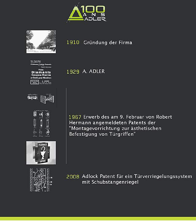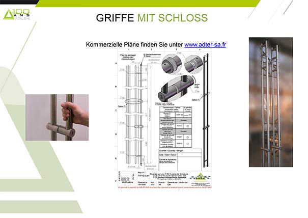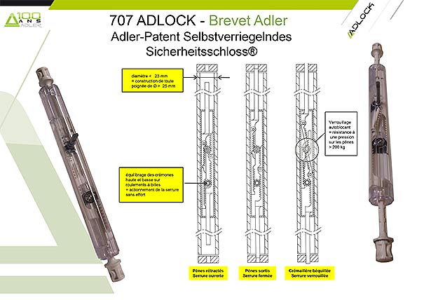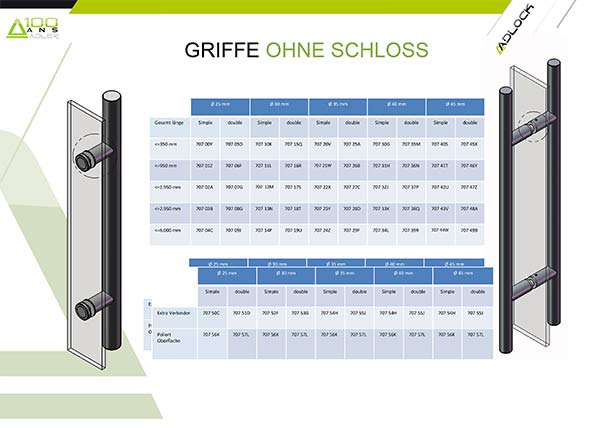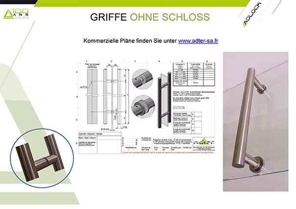ADLOCK bietet eine komplette Palette Griffe, Türbänder und Verbinder aus Edelstahlrohr mit Durchmessern von 20, 25, 30, 35, 40 oder 45 mm, in gebürsteter oder polierter Ausführung. Diese Produktpalette verwendet mehrere Patente von ADLER SAS für die außerordentliche Glasbefestigung (Befestigungspunkte ADLOCK mit einem Durchmesser von 30 mm und M8-Schraube, die fest angezogen werden kann) sowie für selbstschließende Sicherheitsschlösser.