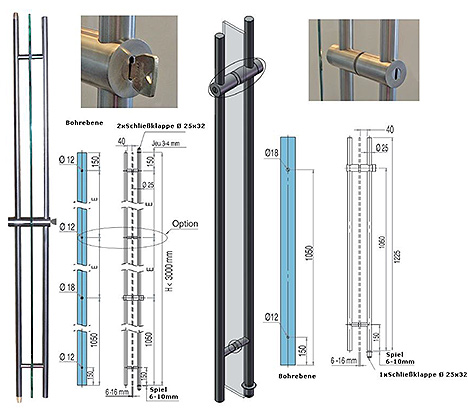 Die Türbänder über die volle Höhe, wie auch die einfachen Verbinder können auf die Scheibe geklebt werden (Abstand zwischen Scheibe und Innenrohr = 2,5 mm) oder sie können mittels Distanzscheiben, die denen der Griffe ähnlich sind von der Scheibe entfernt angebracht werden (Abstand zwischen Glasoberfläche und Innenrohr = 40 mm). Im zweiten Fall wird die Steifheit der Konstruktion noch weiter erhöht, die Reinigung vereinfacht und es ergibt sich eine interessante Ästhetik. |