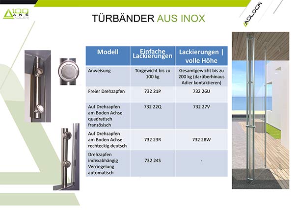 ADLOCK-Türbänder (haben immer einen Durchmesser von 25 mm*) können auch mit einem Drehpunkt am Türsturz ausgestattet werden, z.B. JANUS von SEVAX. Die Tür bewegt sich also um einen freien, unteren Drehpunkt und ist an einem oberen Drehpunkt befestigt, der mit einem für türsturzmontierte Drehachsen geeigneten Einsatz ausgestattet ist (Achse ist gerade und nicht mehr kegelförmig).