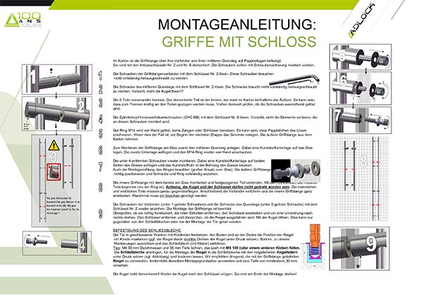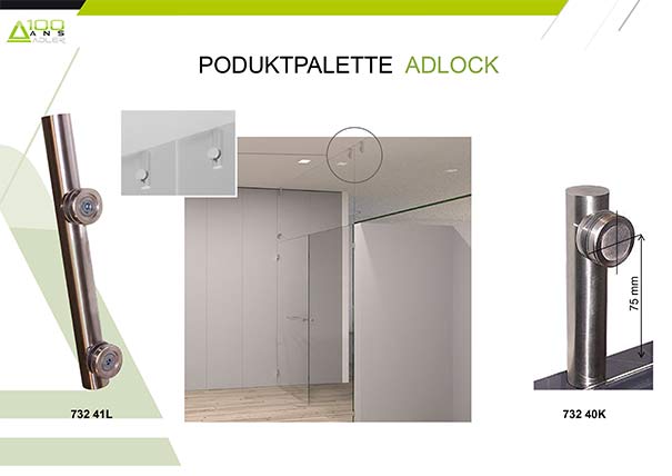 Das ADLOCK-Programm ist mit seinen hochwertig verarbeiteten und bewährten Bauteilen modular ausgelegt: Sicherheits-Schließmechanismus mit 23 mm Durchmesser; Befestigungspunkte für Hartglas (Verbundglas oder nicht) und für nicht gehärtetes Verbundglas, Dm.60 mm; widerstandsfähige, in die Rohre eingearbeitete obere Verschraubungspunkte; verkleinerte Einsätze für verschiedenartige Verbindungen usw.