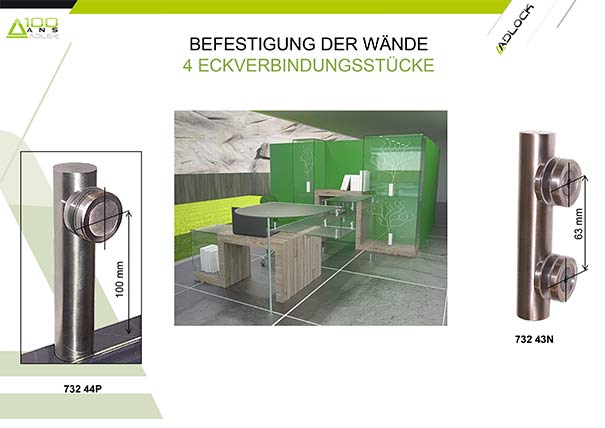 Die Glasscheiben sind mit ADLOCK-Befestigungspunkten an den waagerechten Rohren befestigt. Die Rohre werden gehalten und haben gleichzeitig eine vertikale Stützfunktion. Diese Rohre bilden Versteifungen (wie die Versteifungen bei Duschwänden); sie verwenden die gleichen Wandbeschläge, Anschlagwinkel (Ausgangspunkt 90° von der Wand oder einer Glasscheibe) oder Winkel (von 90° bis 45°). Zwei Rohrwinkel können durch einen Verbindungswürfel fest miteinander verbunden werden. Sie können auch in einem freien Winkel zwischen 90 und 45° durch die gleiche Isolierschicht miteinander verbunden werden, an der eine Versteifung an der Wand oder einem Glasflügel befestigt werden kann. |