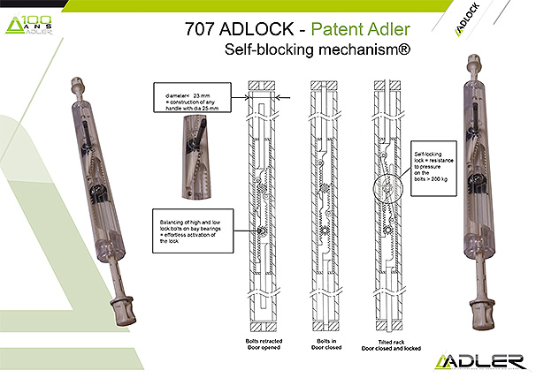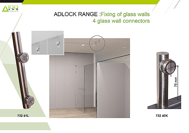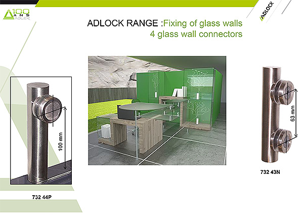 La gamme ADLOCK est conçue pour être modulaire, s’appuyant sur des composants très élaborés et parfaitement éprouvés : mécanisme de serrure de sécurité en diamètre 23 mm ; points de serrage pour verre trempé (feuilleté ou non) et pour verre feuilleté non trempé – dia.60mm - ; points de vissage haute résistance usinés dans des tubes ; inserts miniaturisés pour accouplement à des fonctions variées,…