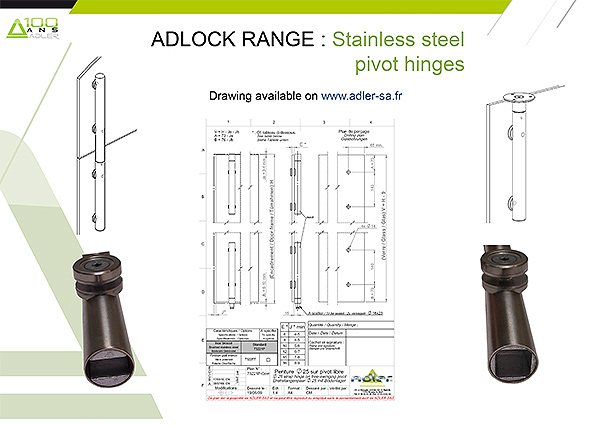 ADLOCK is a complete range of brushed or polished stainless steel tube door handles, hinges and connectors, in diameters of 20, 25, 30, 35, 40 or 45 mm. It uses several ADLER SAS patents for extraordinary glass hold (30 mm diameter ADLOCK points with one M8 screw to be tightened fully), such as for the auto-locking security mechanism.