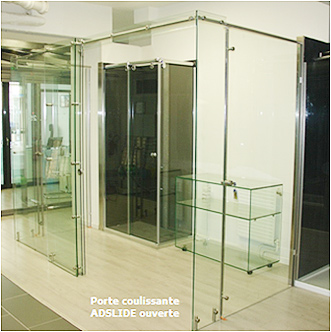 - Une conception simplifiée : avec ADSLIDE, tout est contenu dans des diamètres 25mm. Tous les systèmes peuvent s’interconnecter, y compris avec ADLOCK, sans risque de collision d’une porte avec une pièce en excroissance : fixation d’extrémité de rail, fixation sur verre,… Par exemple, si besoin y compris pour des raisons esthétiques, 2 rails peuvent être fixés symétriquement sur une même glace fixe et, dans le prolongement de celle-ci, suspendus au plafond ou fixés sur une imposte, le tout de façon parfaitement standard.