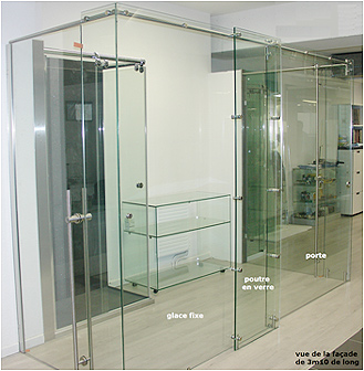 La glace fixe de façade est agrafée sur le rail tubulaire qui est porté en son centre par cette glace. En somme, la glace fixe supporte à elle seule entre 50% et près de 80% du poids de la porte. Elle supporte également d’éventuelles surcharges accidentelles, comme celle d’une personne qui se suspendrait au rail. Pour des glaces d’épaisseur 8mm, et des hauteurs raisonnables – jusqu’à 2m40 -, la largeur admissible d’une telle façade, sans aucune suspension au plafond ni aucun raidisseur particulier (Cf. § « des constructions de plus grande envolée »), peut atteindre 2m30 avec une porte de 1m20 de largeur environ et une ouverture de l’ordre de 1m10. Au-delà, il convient de valider la raideur de l’ensemble. |