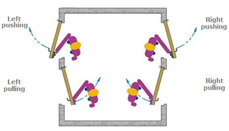 With CAPSI Isodouche, the self-closing range is widened: theoretically from +/-45° around the closing position (offset by ), within the limit of +/-90° total opening. For safety purposes, and to cope with acceptable assembly imperfections (e.g. slight misalignment of the upper and lower hinges) and friction torque resulting from a heavy door, an automatic closing range of +/-30° is used. Thanks to a reduced self-closing angular range, the ISODOUCHE version is that ensuring the most accurate closing, remaining effective with the heaviest doors. |