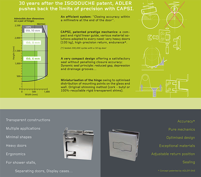 - with advanced and patented mechanical principles (*), and the use of above standard materials, the highest precision in closing and construction of sealed and gasket free shower cubicles or partitioning of offices without floor pivots …