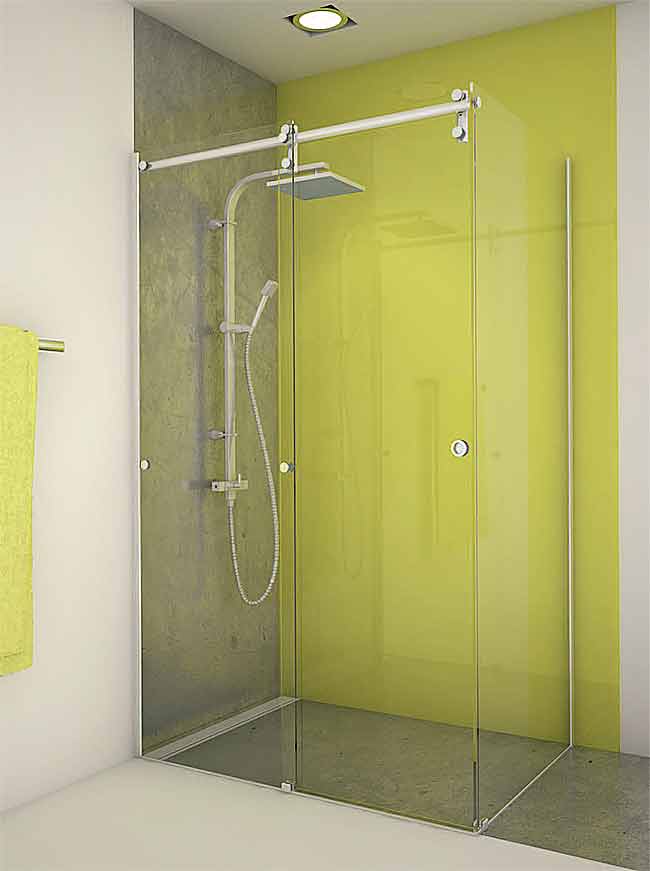 Toujours en fini Inox brossé, une construction originale, en coin, d’une cabine à double portes coulissantes pour un accès optimal malgré des dimensions extrêmement réduites. Conçu ici comme l’assemblage de deux façades coulissantes. La glace fixe de droite est chromée, formant un miroir sans tain : elle agrandit la salle de bain vraiment petite et l’espace autour de la vasque en prolongeant le miroir sur lavabo. Les autres glaces sont Showerguard®, c’est-à-dire avec un traitement anticalcaire garanti maintenant à vie : un « must» pour une cabine qui doit rester transparente sans exiger d’entretien particulier. |