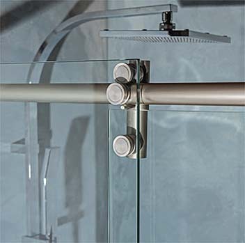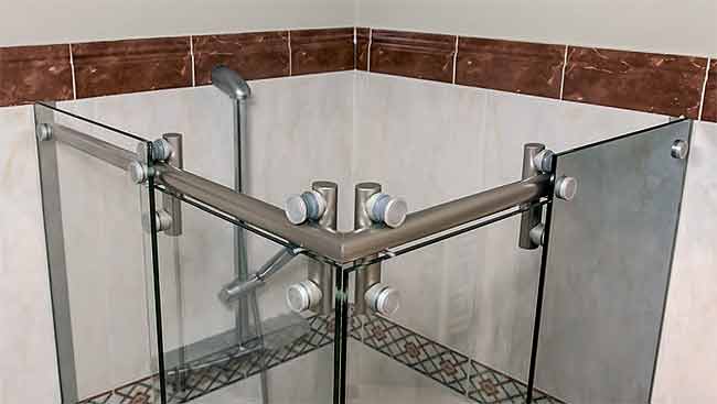 Détail de la connexion verre-verre dans le cas d’une cabine en coin avec une façade coulissante et un retour fixe. Simplicité de la conception, pureté des lignes, efficacité de la construction. |