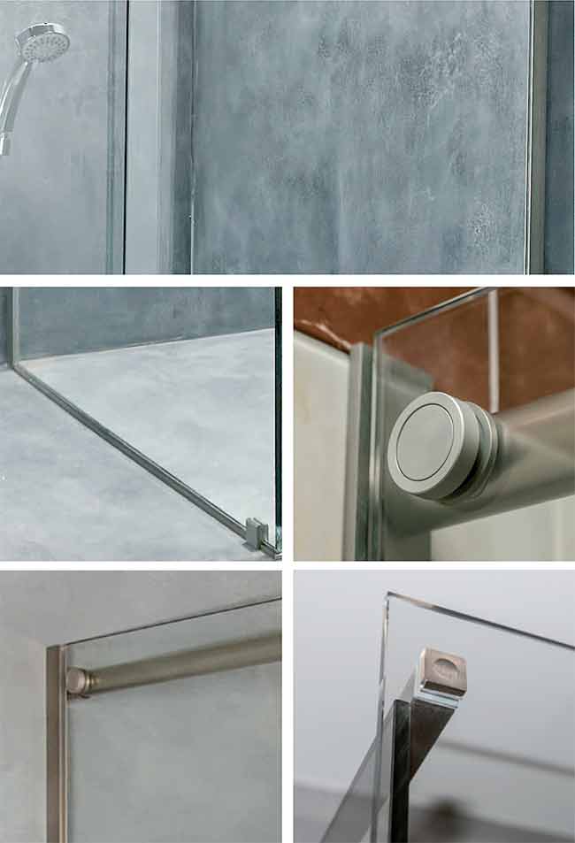 Au sol, un seul profil de seuil collé en pleine longueur pour fixer les petites « griffes » qui sertissent la glace fixe. En toute sécurité, sans percer le receveur pour prévenir tout risque de fuite ultérieur. Une solution inédite qui remplace avantageusement les profils habituels en feuillure : transparence, hygiène, esthétique, résistance…
