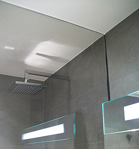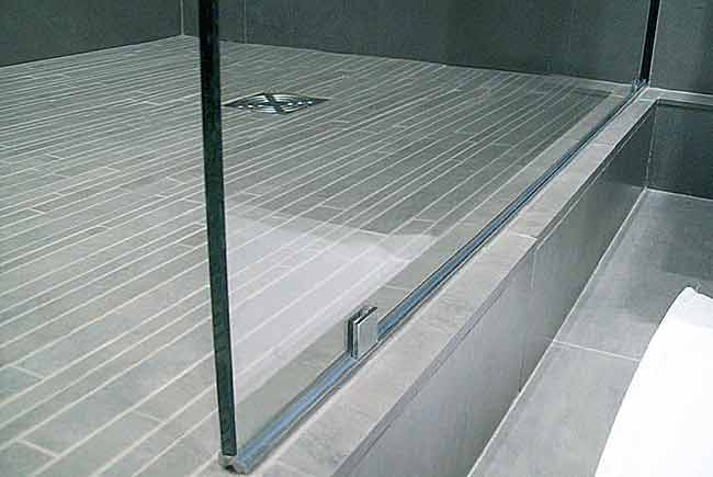 Quand cela est encore possible, le profil mural est dissimulé dans l’épaisseur du carrelage. En pleine hauteur, la glace peut être raidie en partie haute par une feuillure dans le faux-plafond. |