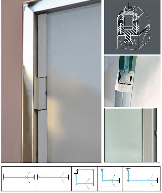 | Pour des constructions encore simplifiées, possibles avec des glaces feuilletées non trempées, permettant un ajustement de +/– 8 mm de la porte et de +/– 5 mm des glaces fixes. |