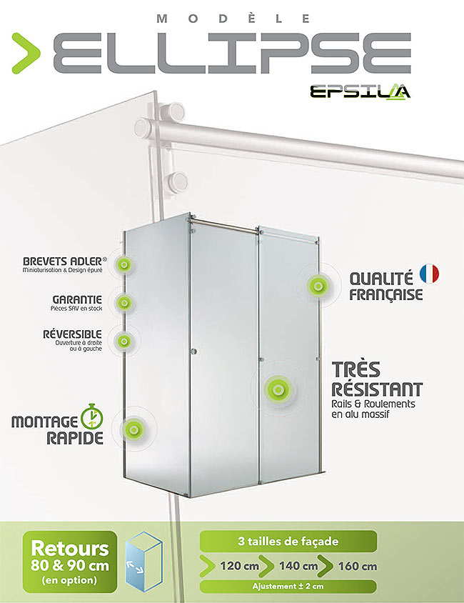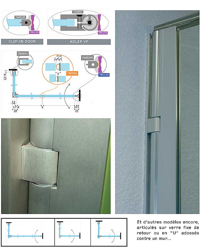 | Charnière CLIP-IN DOOR certainement la charnière la plus petite du marché avec une résistance inégalée. Développée et brevetée par ADLER SAS et Saint GOBAIN GLASSOLUTIONS, une autre solution extraordinaire pour vos parois de douche, plus transparente que jamais... de nombreuses constructions possibles. |