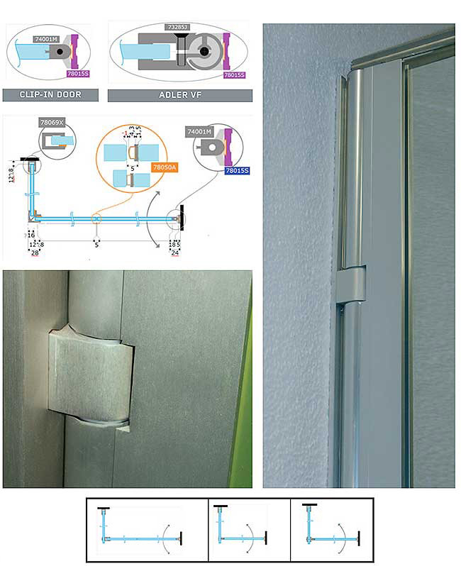 | Charnière CLIP-IN DOOR Without any doubt the smallest hinge on the market, with unequalled resistance too. Developed and patented by ADLER SAS and Saint GOBAIN GLASSOLUTIONS, another extraordinary solution for your shower enclosures: more transparent than ever and with several different construction types possible. |