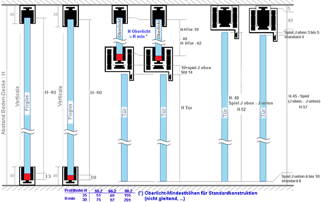 Bemessung der fixen Wandelemente, Türen und Oberlichter in der Höhe: |