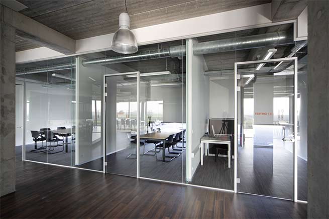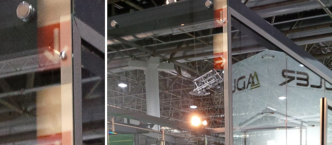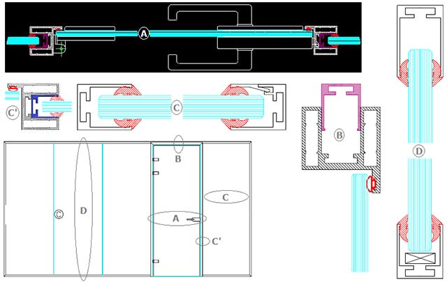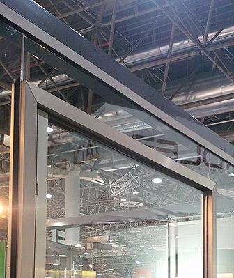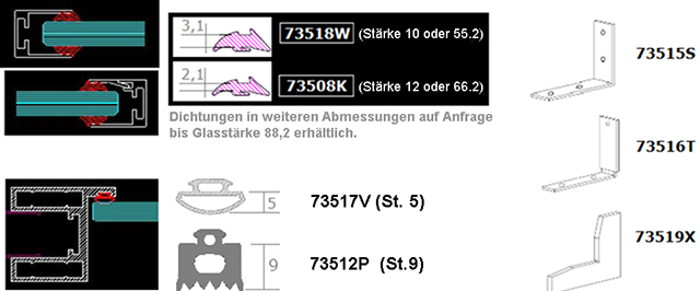 Die Glasstärken (10 oder 12 mm serienmäßig, bis 88,2 mm auf Anfrage) werden mit passenden Dichtungen in den Standardaluminiumprofilen ausgeglichen. |