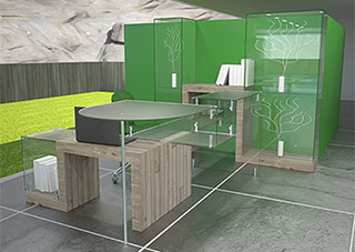 Installation d’une glace fixe (dormant, cloison,…) : Tous les modes d’installations classiques : profils plinthes ; feuillures en sol, mur ou plafond ;… sont possibles et peuvent se marier très avantageusement avec des portes de très grandes tailles, idéalement sol-plafond, sans imposte grâce aux avantages des pentures et poignées ADLOCK.