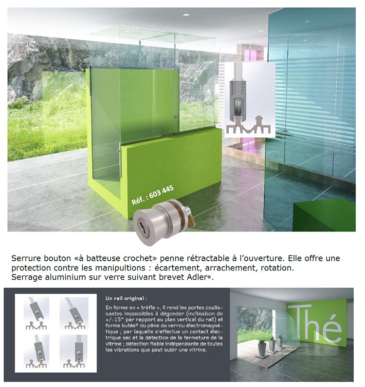 Sécuritrack met en œuvre plusieurs solutions inovantes Adler® de verrouillage mécanique et électromagnétique toujours miniaturisées, voire invisibles et très sécurisées.