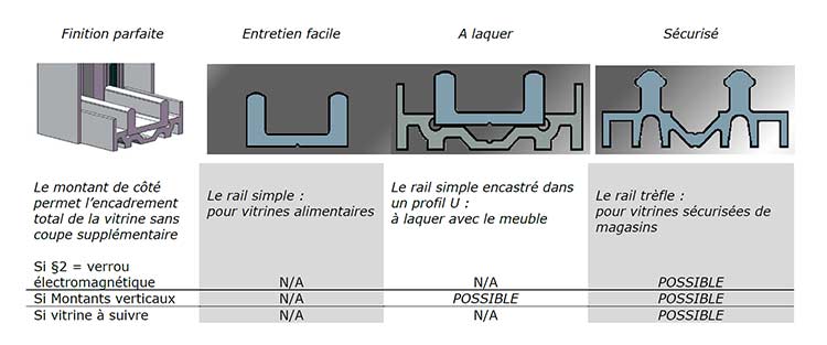 | Les 3 modèles ci-dessous illustrent une partie des variantes possibles d’installation de portes coulissantes avec SECURITRACK. Ils comportent tous ici des montants verticaux qui servent : 1) à masquer les défauts d’équerrage du meuble 2) à sécuriser la fermeture de la vitrine contre le crochetage et la flexion des portes 3) à protéger la vitrine de la poussière avec des joints cils en PVC. |